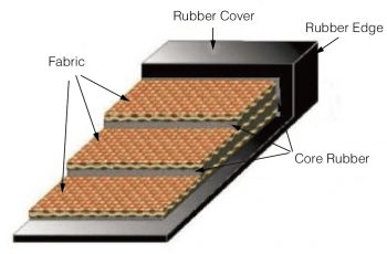 Conveyor belt generally consists of cover rubber, carcass and rubber skim coat. The reinforced breaker fabric is used for extra protection.