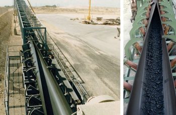 The difference starts after the loading point, where the belt is formed into its typical tubular shape by special idler arrangements over a certain distance and finally is led through idler panels with hexagonal cut outs and offset idler arrangement. At the discharging point, the belt opens automatically after the final idler panel and transfers the material to its next destination.